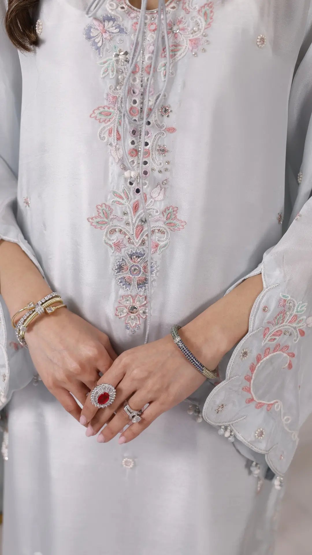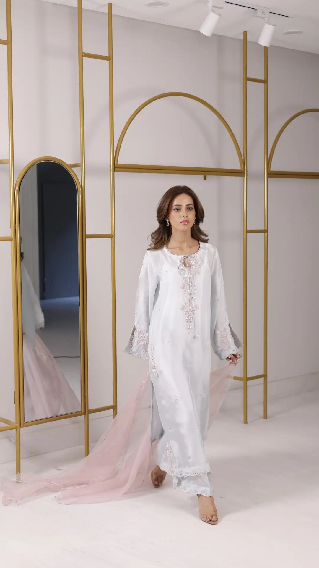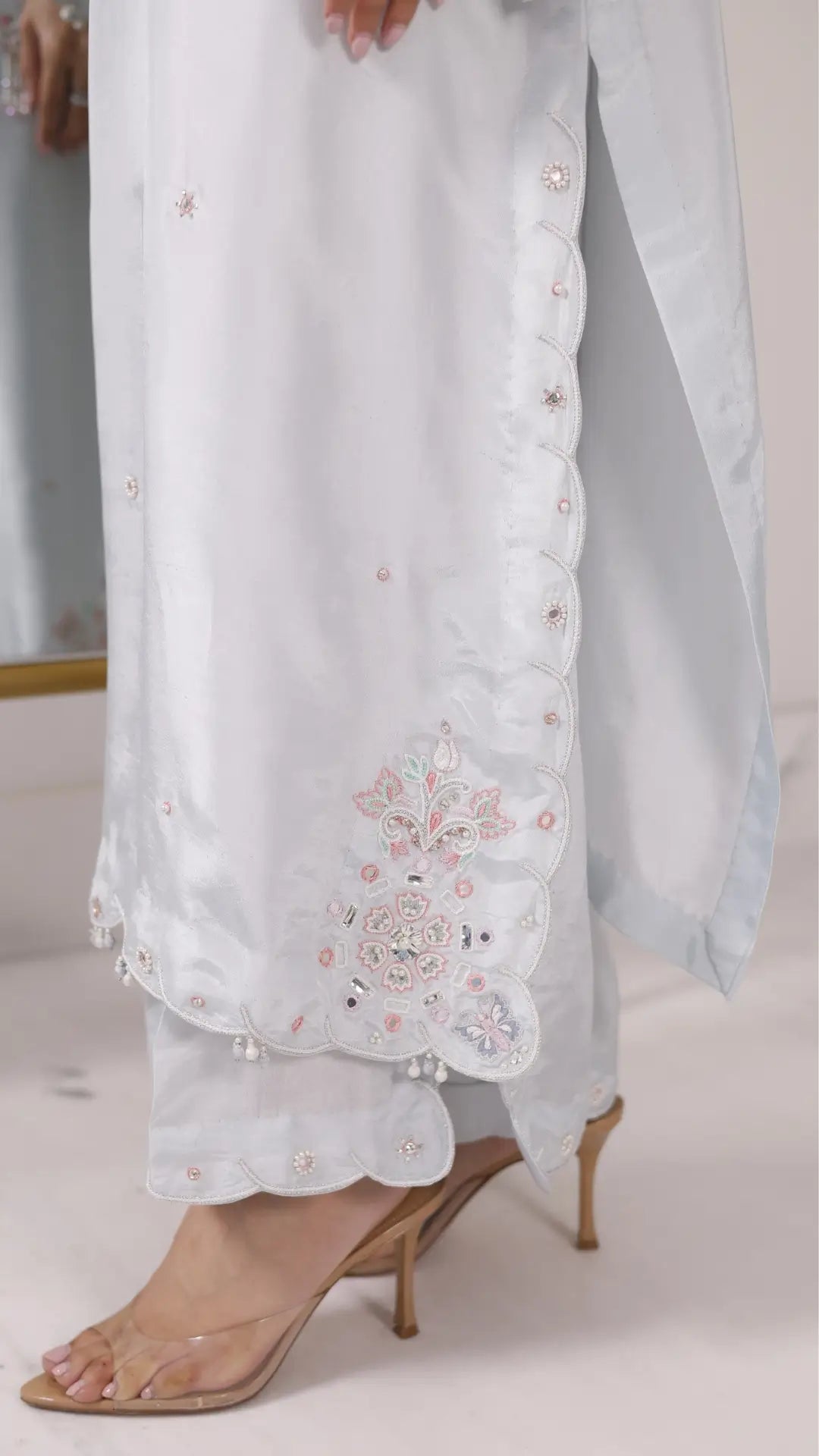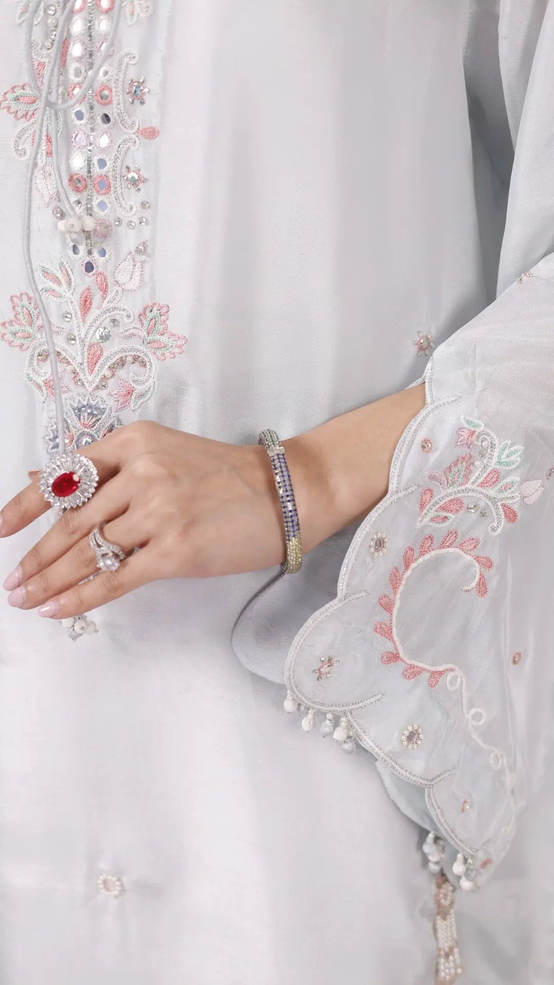 A sumptuous ice blue ensemble 'Dia' is expertly crafted with fine pearls, silk threads and patchwork with meticulously detailed artisanal motifs. A radiant colour palette of mint, ivory and cherry pink on a silk base is matched with scalloped trousers and a blush toned organza dupatta with refined scallop edges. It is designed for moonlit Ramadan evenings and festive Eid soirées.