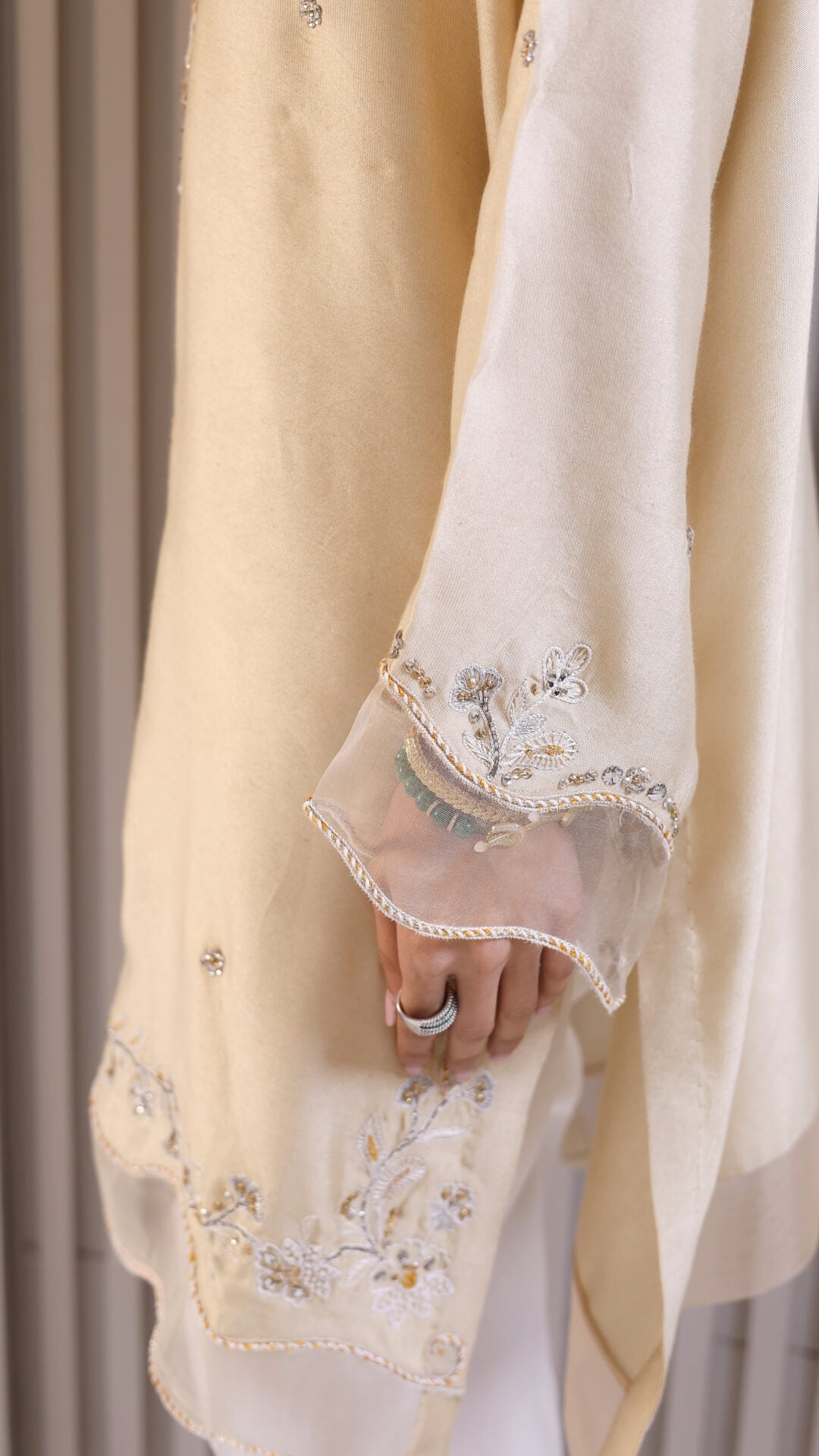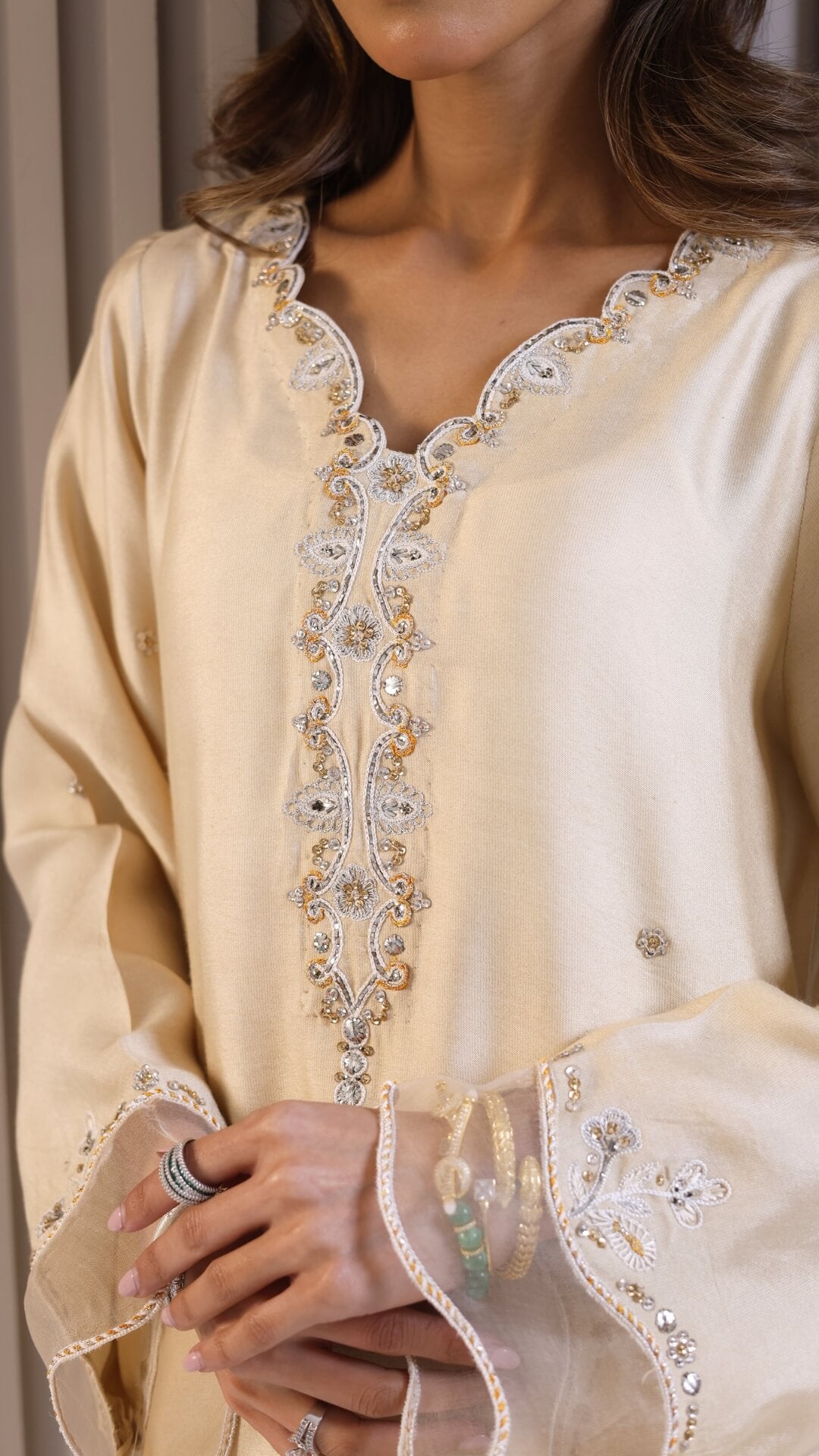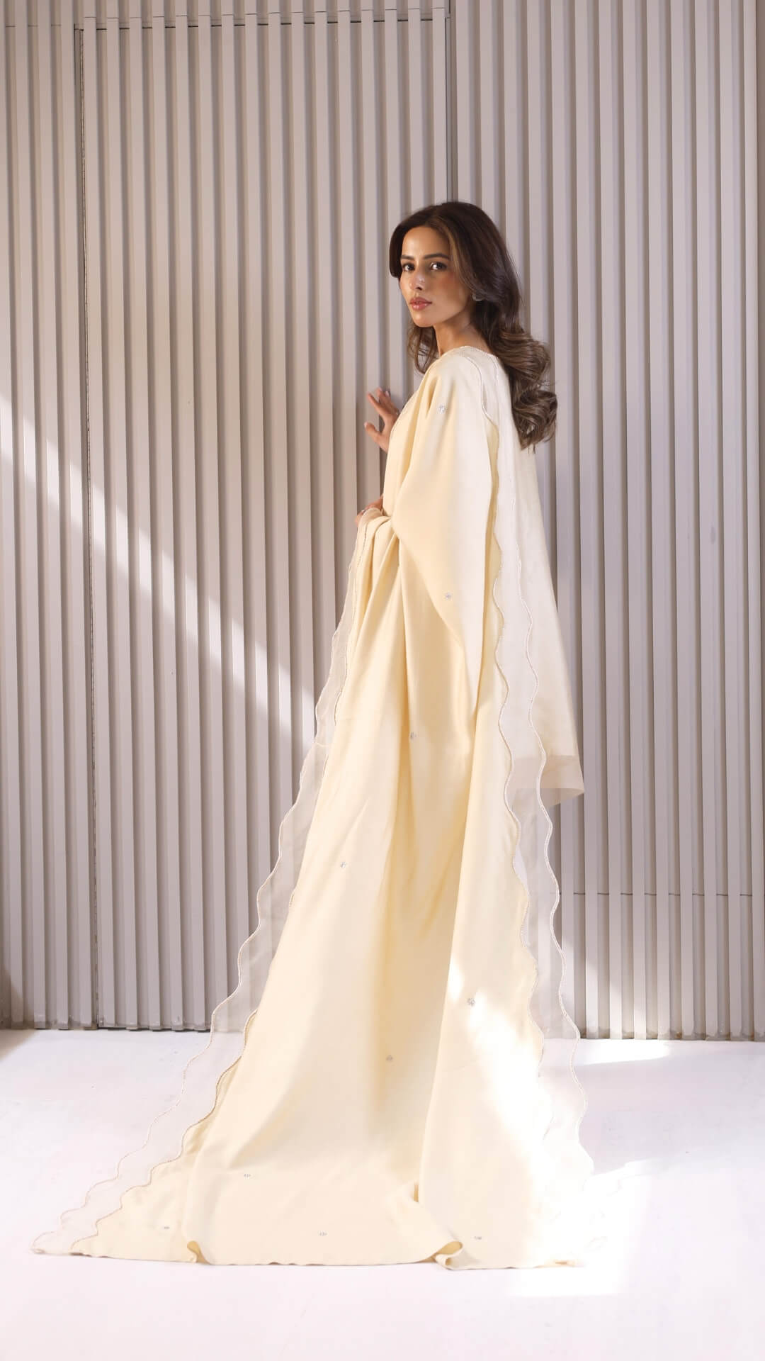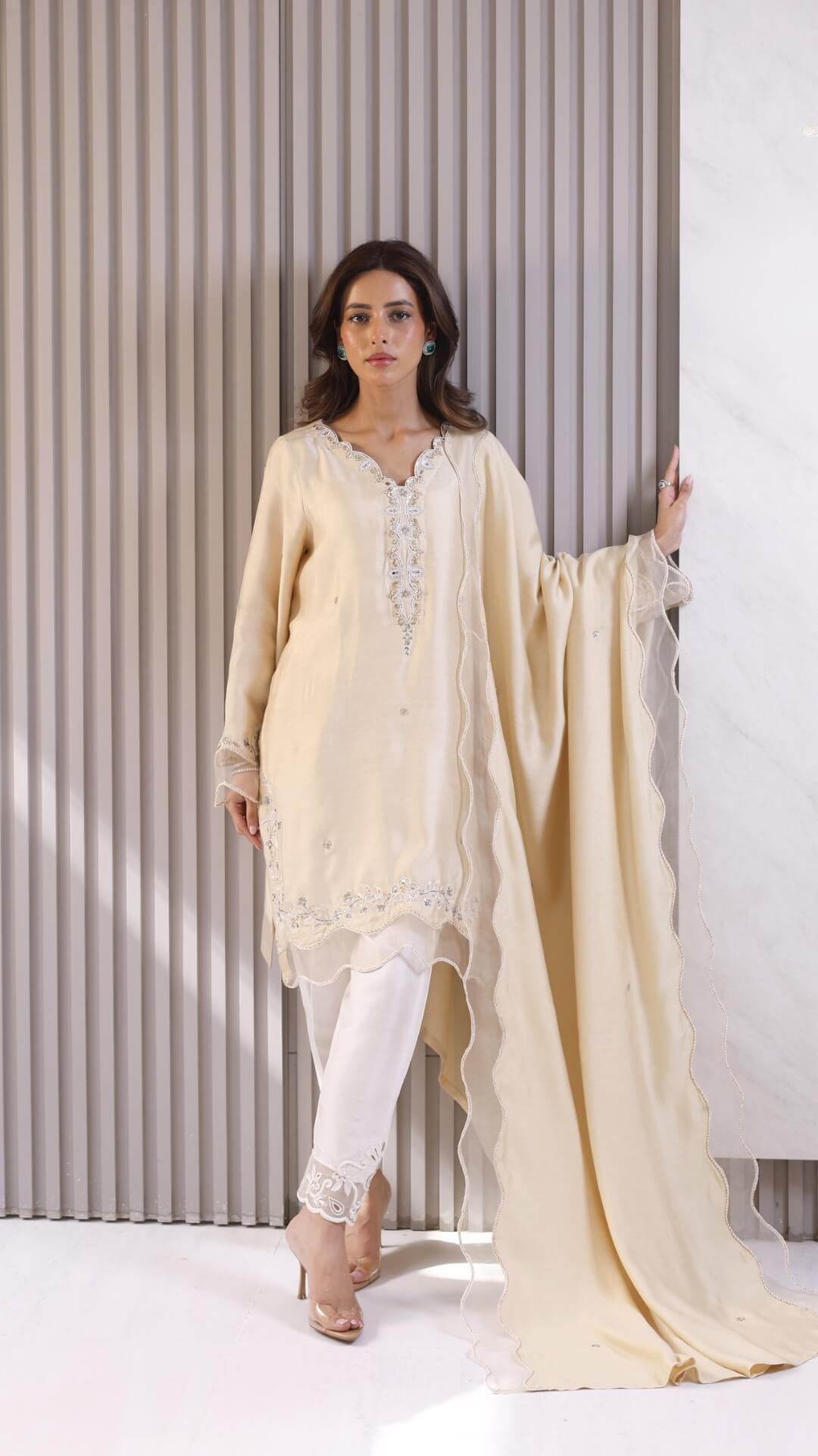 Naturally breathable and fluid, the silhouette is relaxed yet polished. 'Lara' is ideal for daytime festivities, intimate Ramadan gatherings, and quiet celebratory moments. Minimal yet subtle embroideries trail softly on the neckline, sleeves and hem finished with translucent borders on the dupatta and silk shalwar exudes effortless luxury.