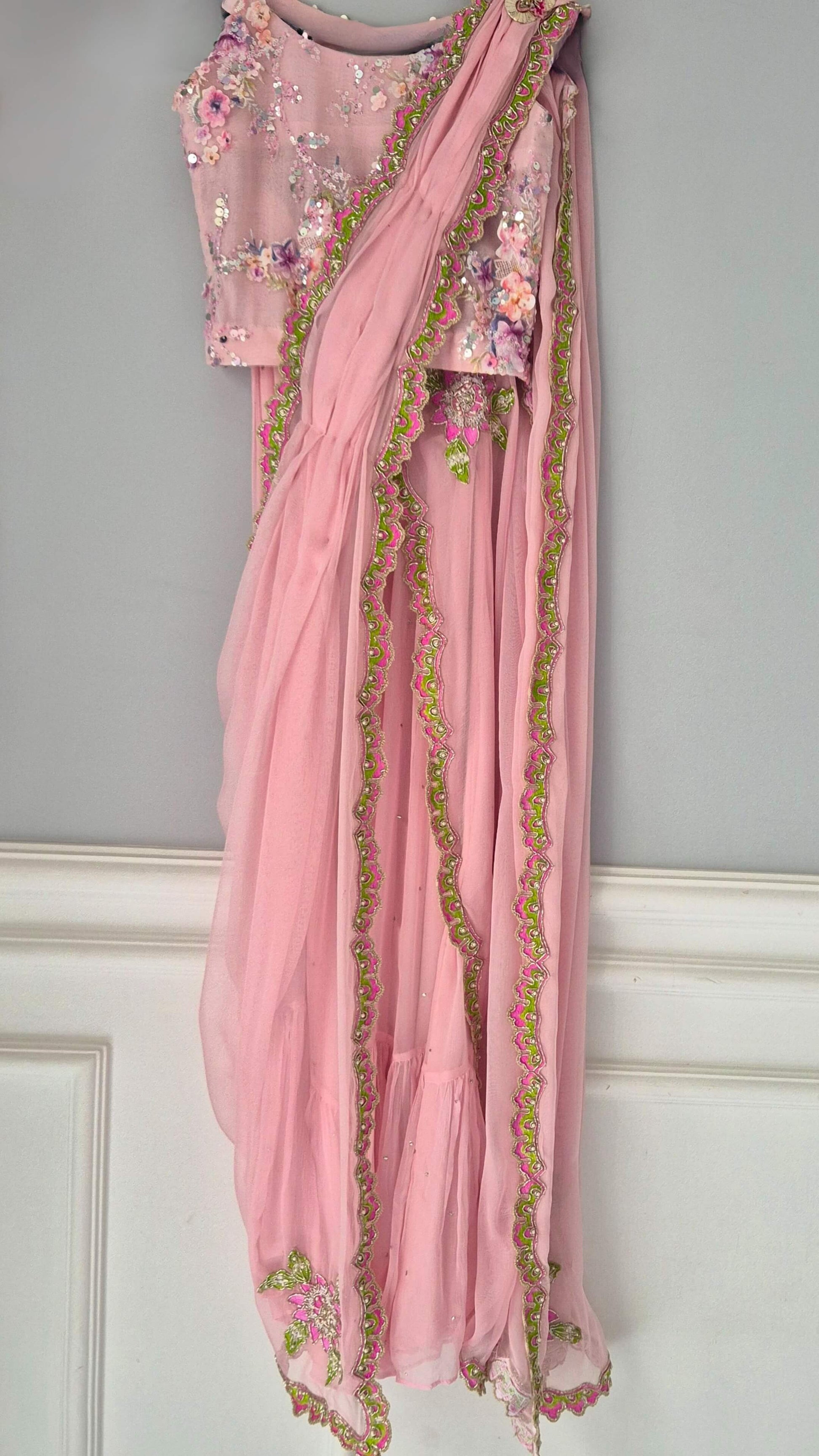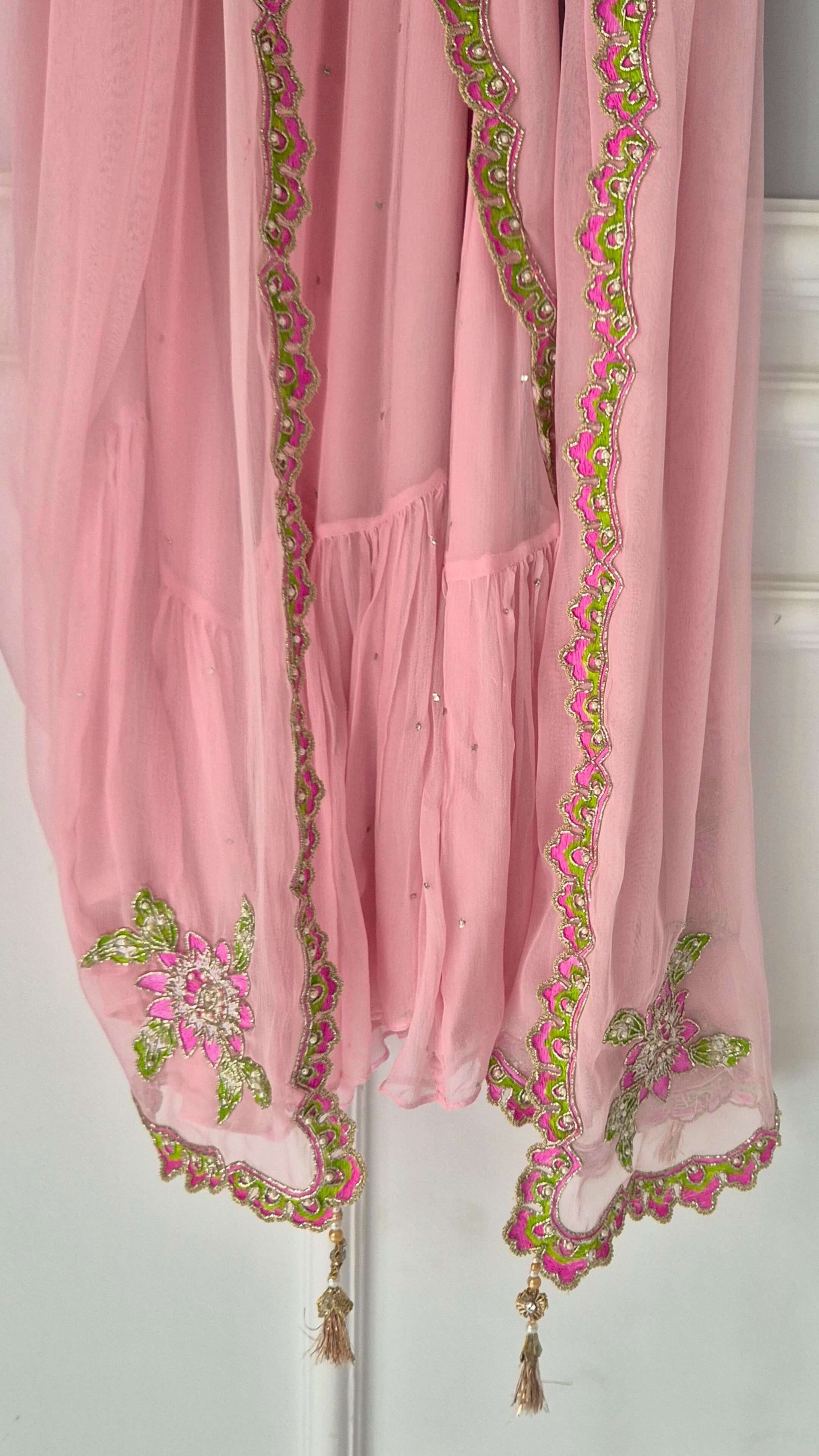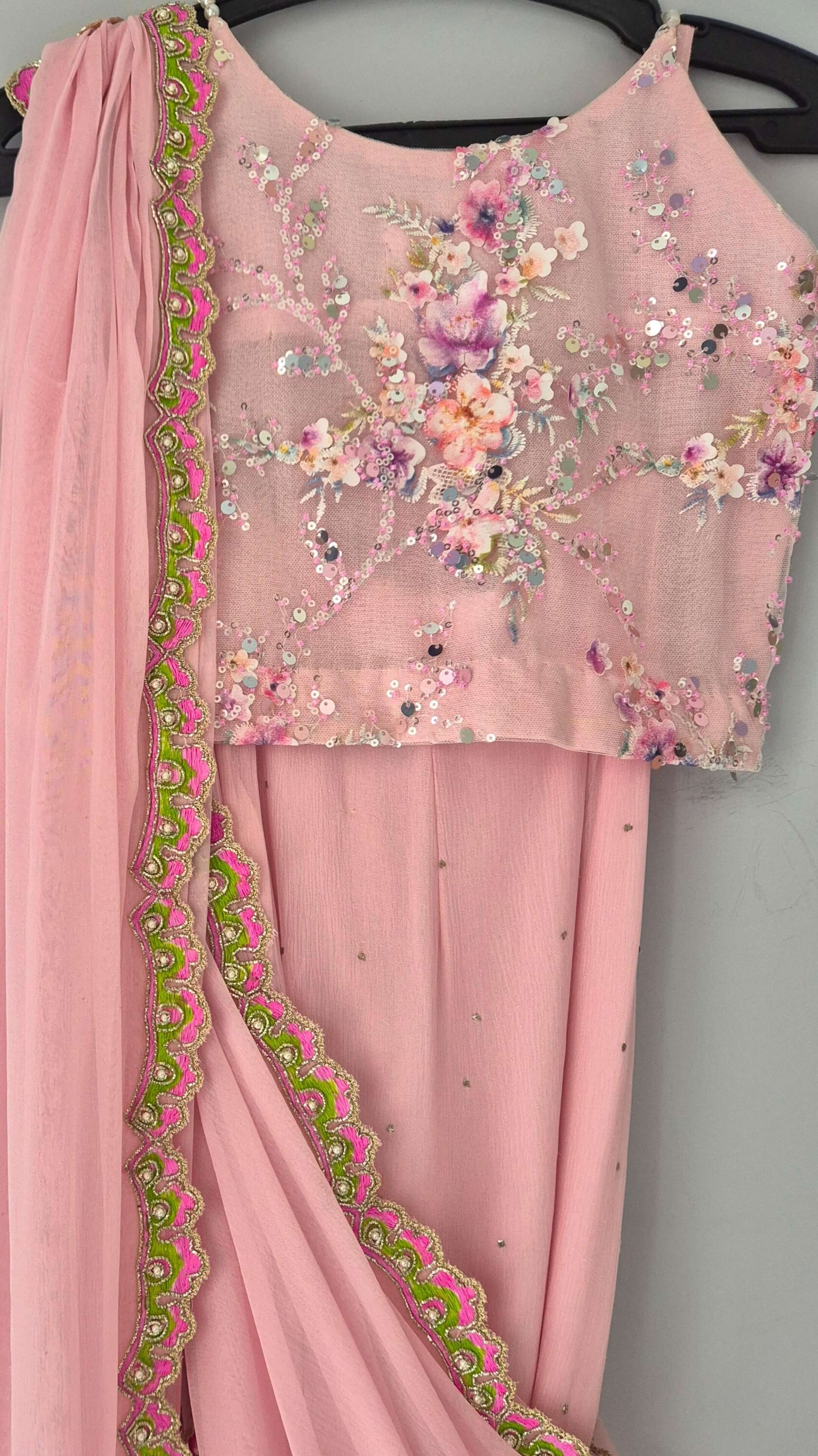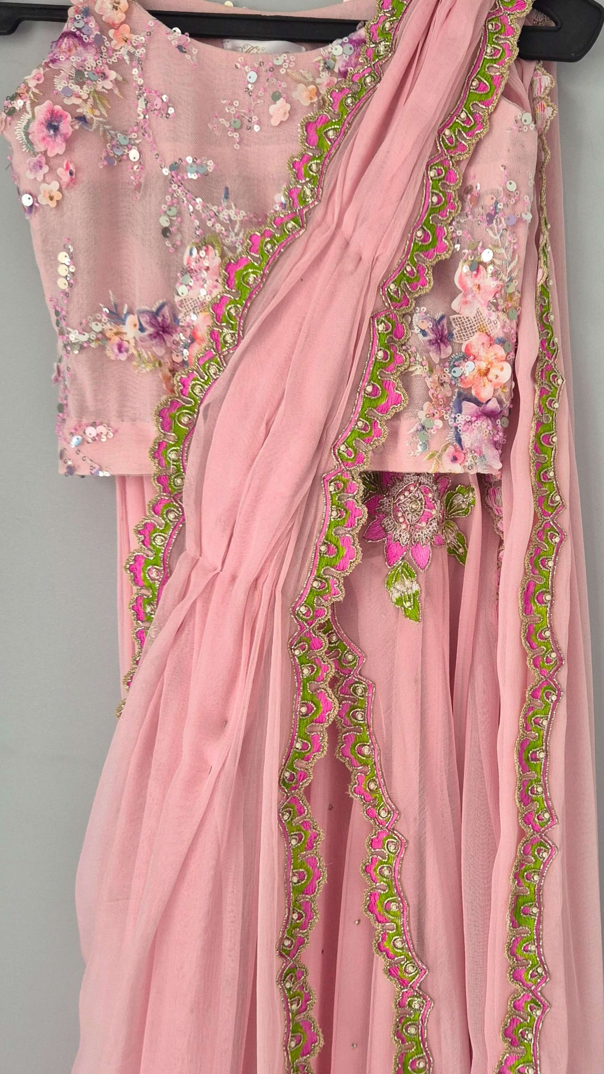 Handworked chiffon drape Mukesh chiffon lehnga with lining and net blouse with lining.