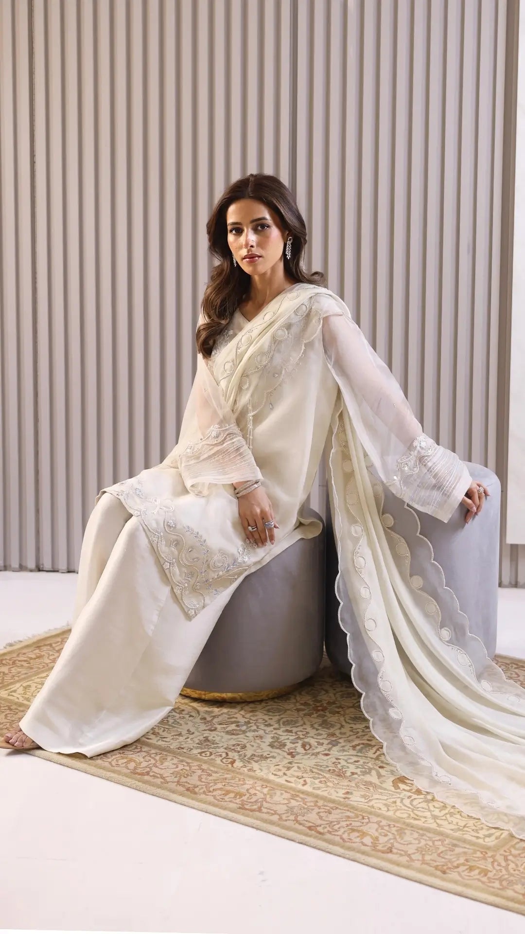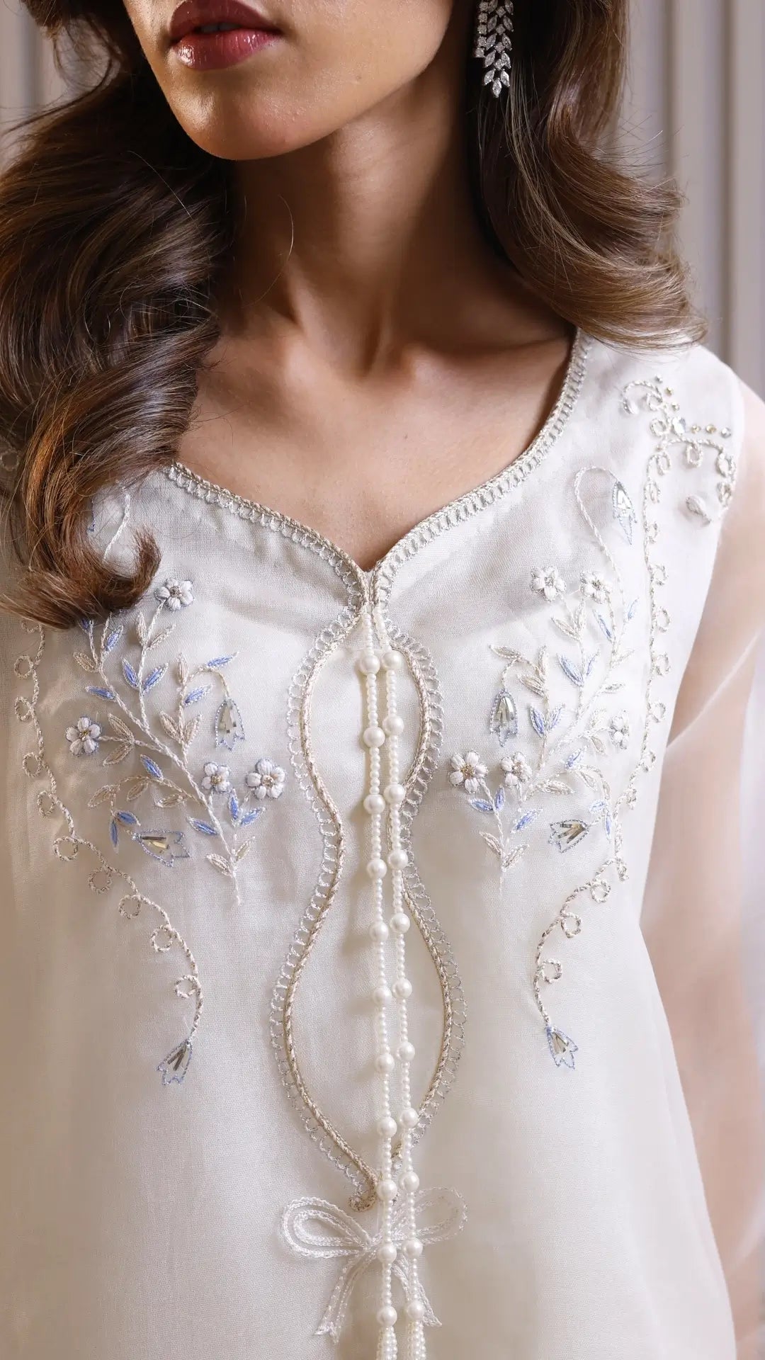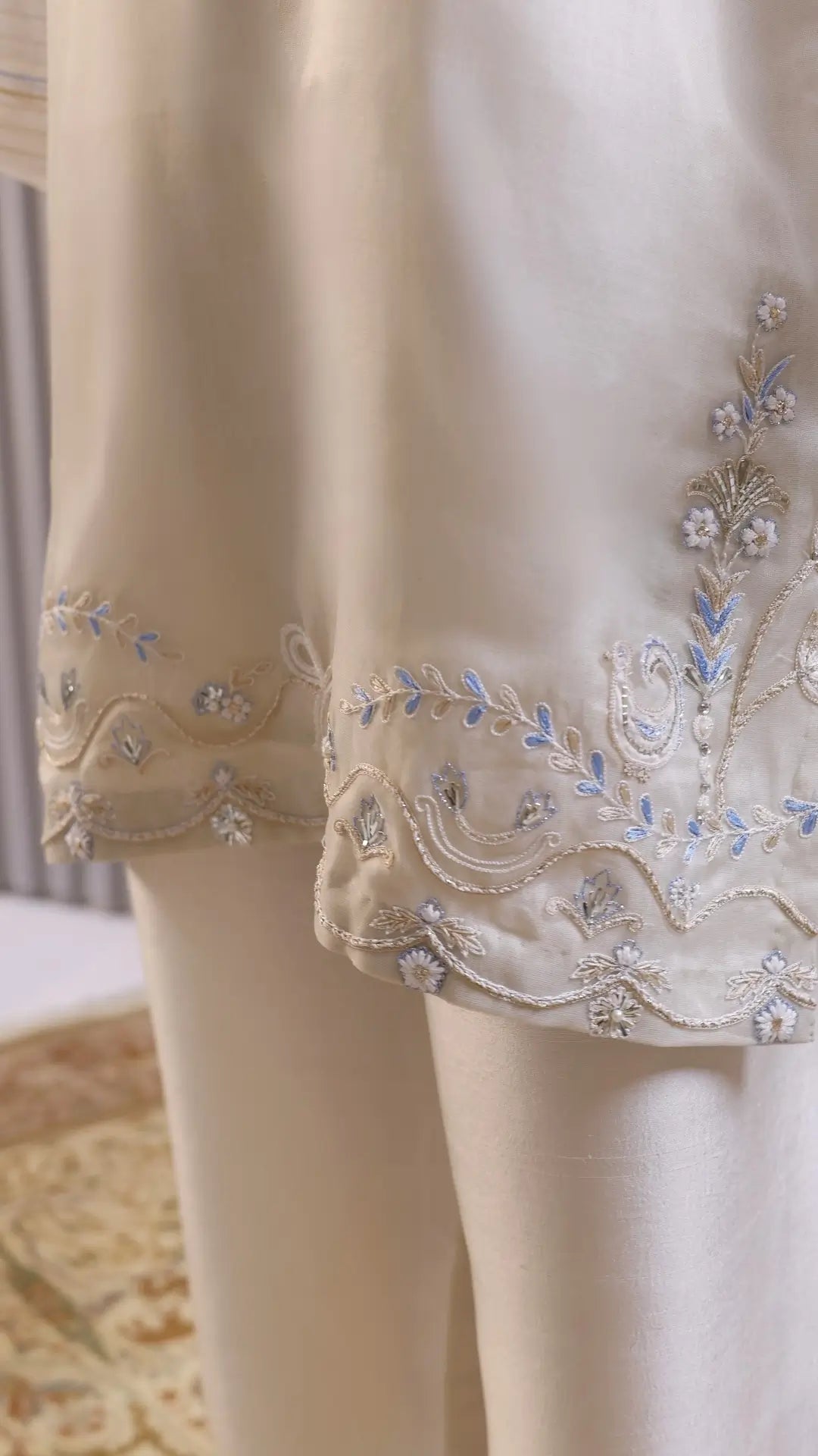 Introducing the latest addition of our semi formal collection, 'Marwa' is a masterpiece of impeccable craftsmanship and timeless elegance. A tender ivory canvas is beautifully designed with botanical florals, mukesh and threadwork. A farshi silk shalwar and dupatta with organza border on all four sides is a serene celebration of the season - where every detail murmurs splendor.