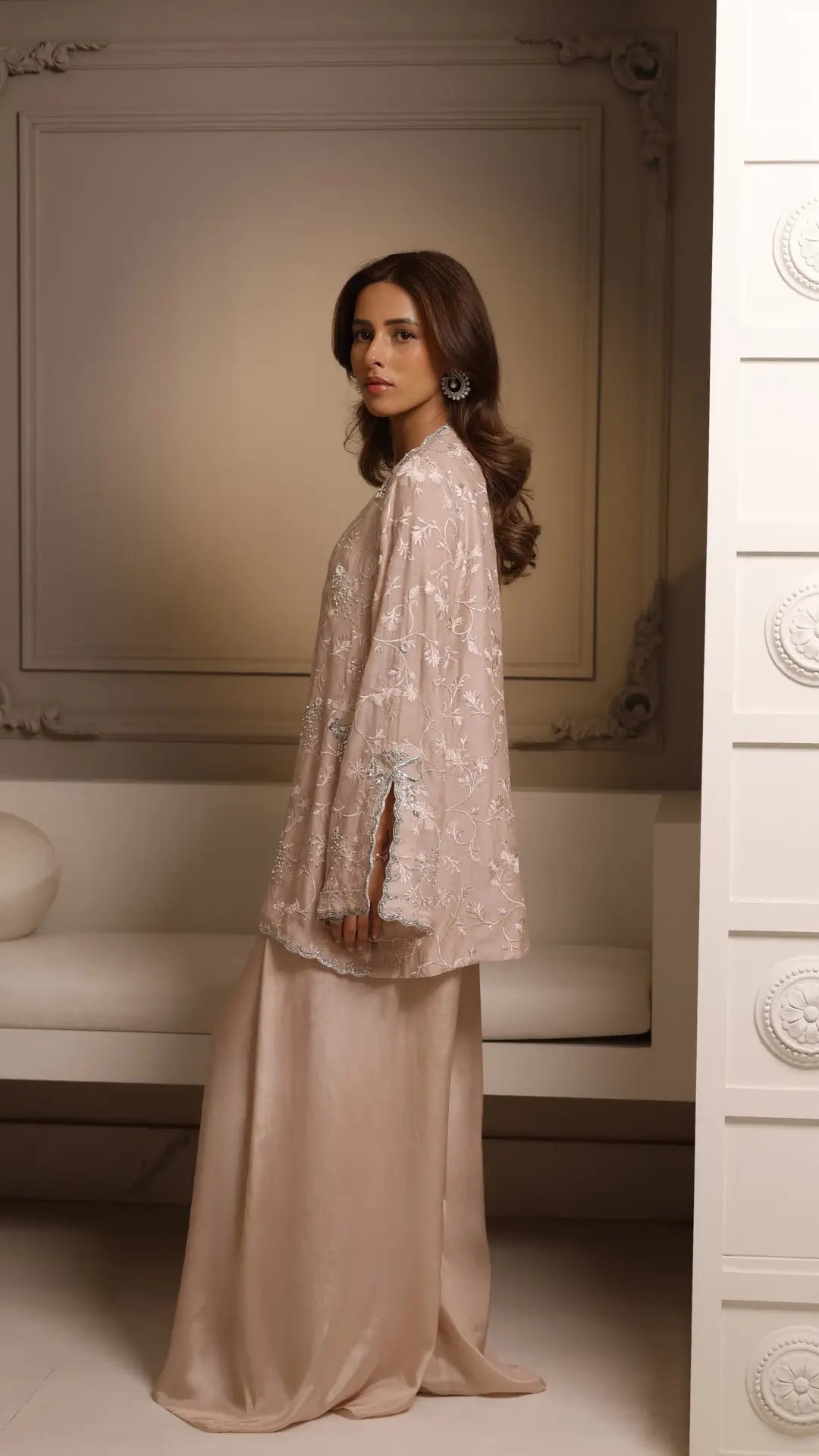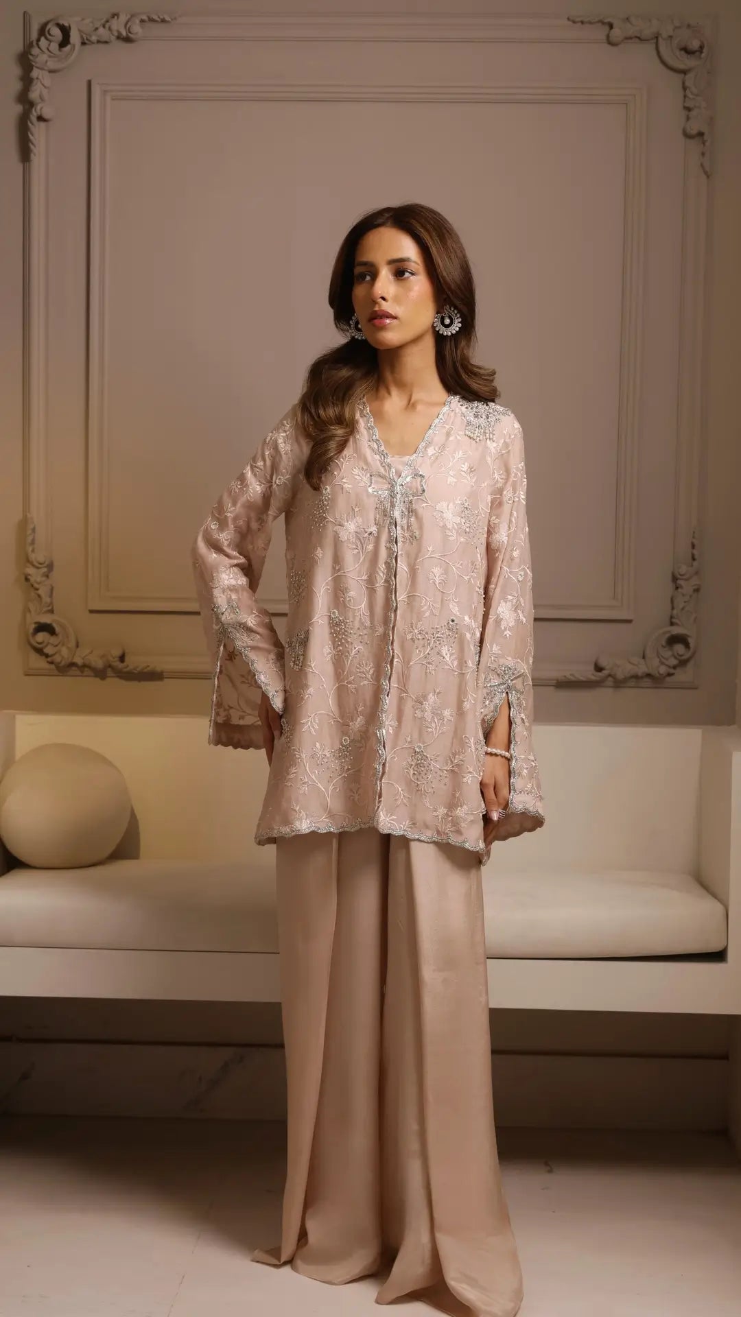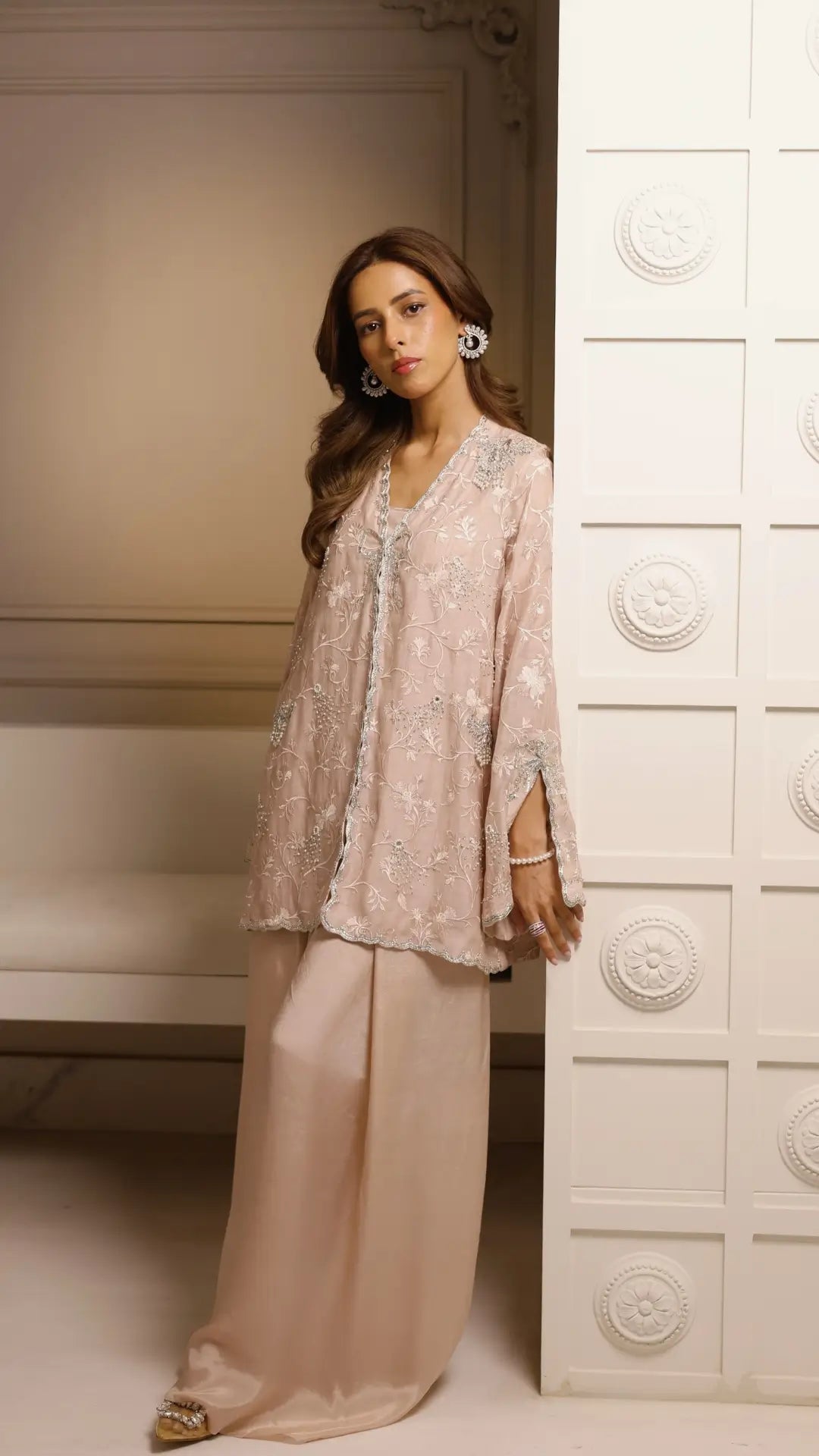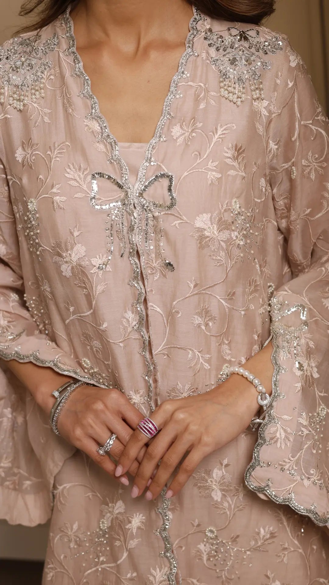 A dainty blush jacket 'Nora' is embellished in delicate pearls, sequins and mukesh on a self-embroidered base. A poised, feminine silhouette with scalloped detailing from the hem to cuff is paired with a jumpsuit evolving the dreamlike stillness of a magical dusk where every shimmer tells a story of moments that deserve to be remembered.