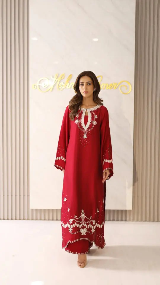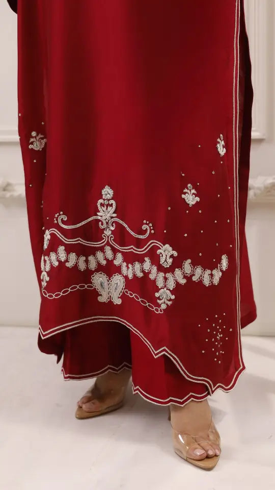 Rendered in a rich maroon shade, 'Rahma' features contrasting ivory interwoven motifs in chain stitch, scattered pearls and mukesh. A thoughtfully curated piece is finished with flattering embroidered accents on the edges of the hem and pants lending to an effortless movement and all-day comfort.