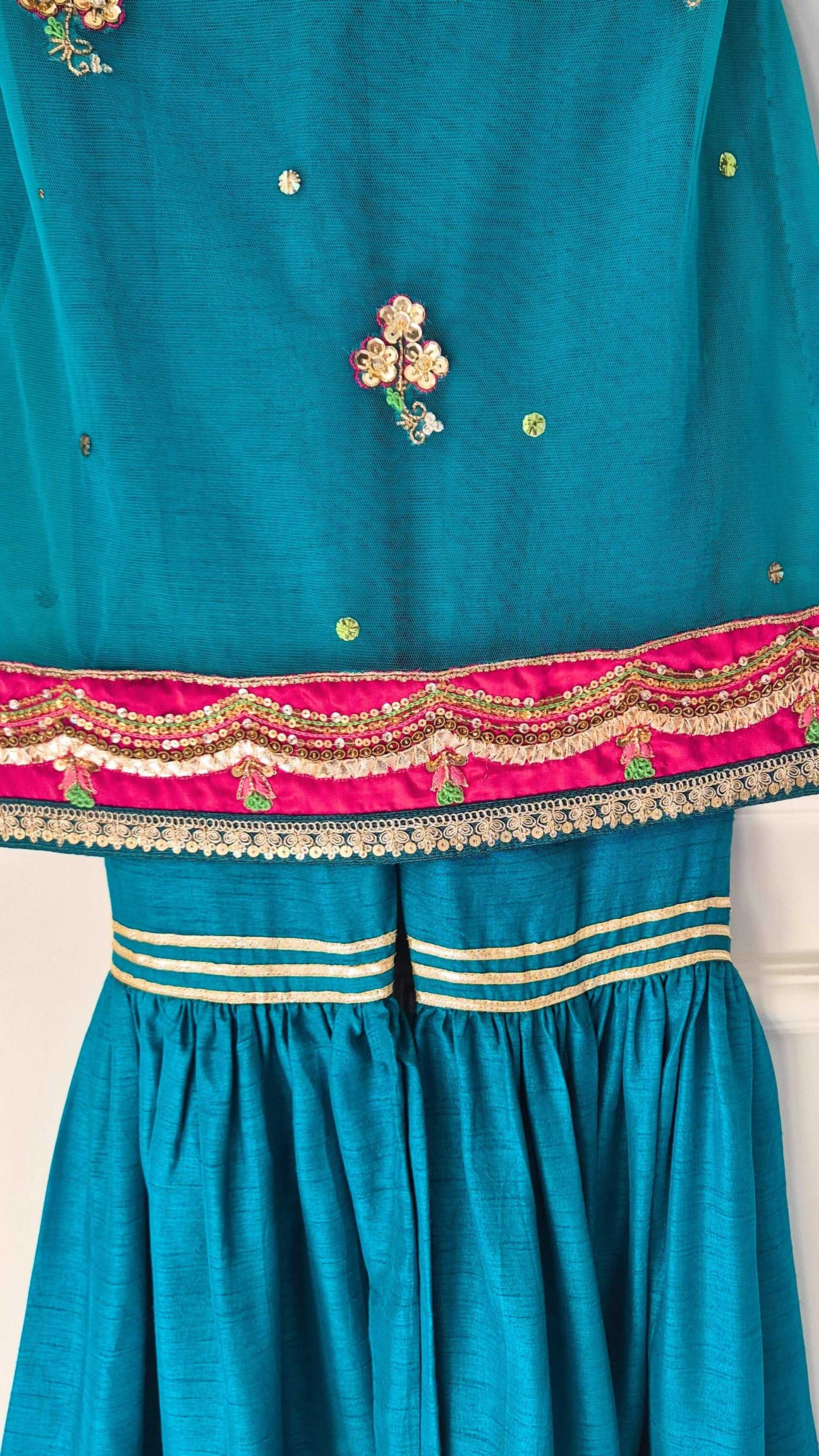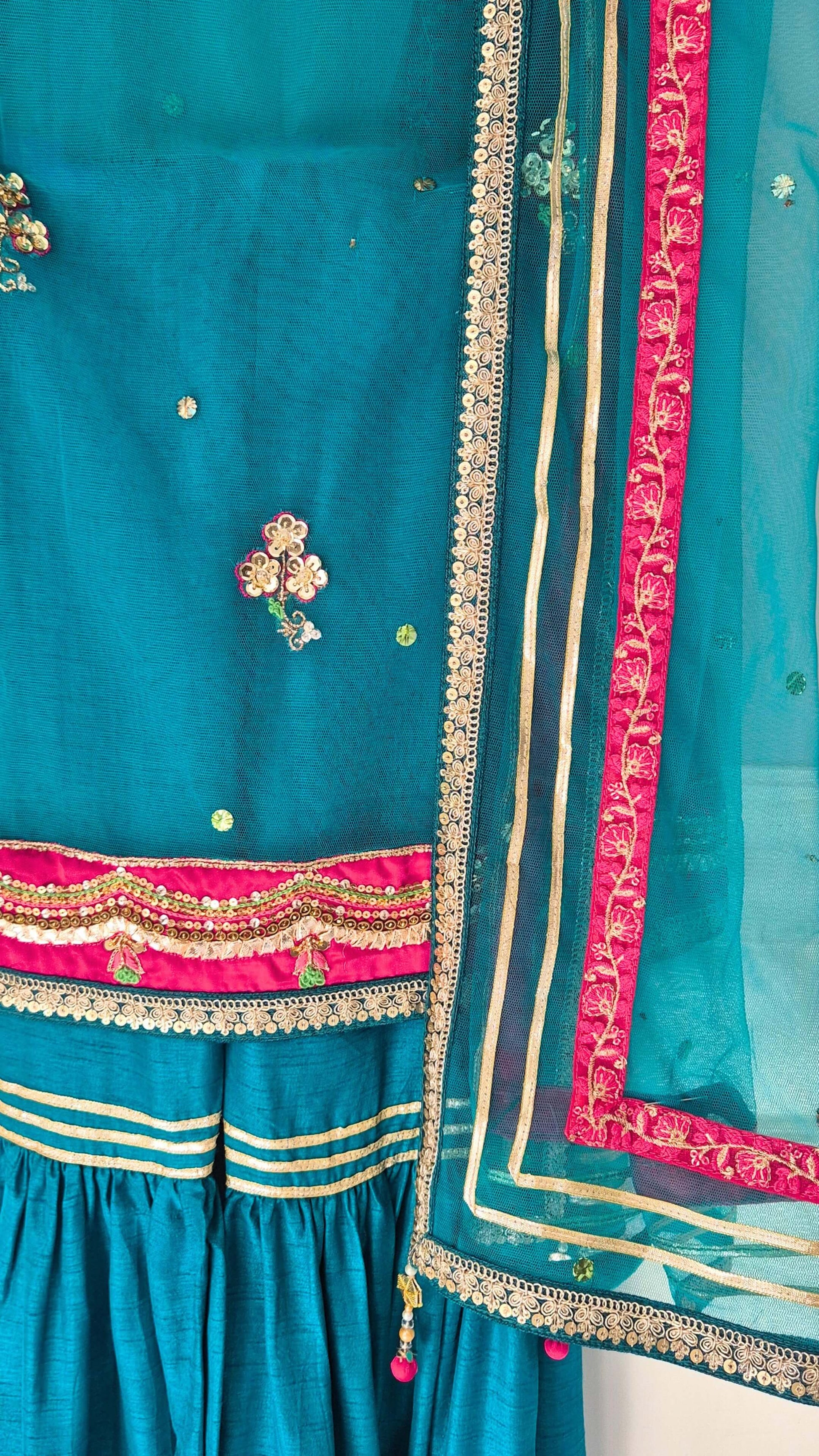 A little sparkle, a lot of teal 🦚 'Rania' is a traditional outfit featuring scalloped patchwork with gold intricate detailing and resham accents with each motif catching the light like heirloom jewels. The dupatta with lace edging and gharara come together for a look that's as picture-perfect as it is comfortable.Â